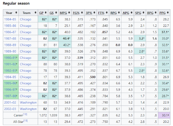 데뷔 시즌 플레이오프를 제외하면 평균득점이 30점 이하로 내려간적이 단 한번도 없다. 이러니 조던 조던 하는게 아닌가 한다.