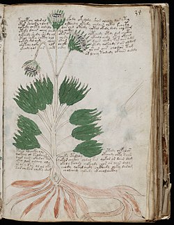 중세의 연금술사나 의사가 자신의 비법(약초 제조법)이 경쟁자에게 유출되는 것을 막기 위해, 자신만 알아볼 수 있는 암호로 적었다는 설입니다.