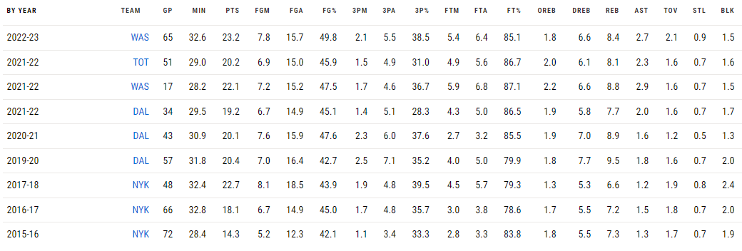 22/23시즌 포르징기스는 65게임에 출전하며 평균 32.6분, 23.2점(커리어하이), 필드골 49.8%(커리어하이) 3점 성공률 38.5% 등 준수한 활약을 한다. 하지만 워싱턴에서의 생활도 또 여기까지가 마지막~~