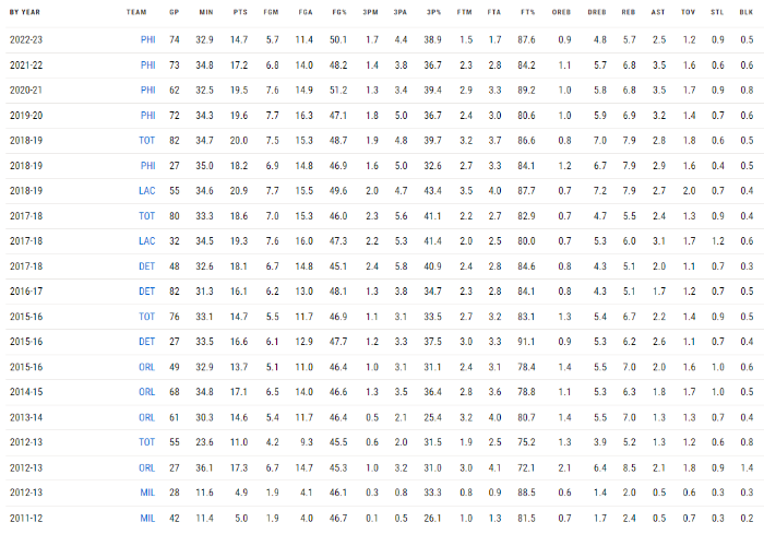 19/20 시즌 - 이 시즌에도 분명 해리스는 제 몫을 해냈다. 기록을 봐도 알 수 있지만 72경기 19.6줌 6.9 리바운드를 기록하며 평균 이상(?)의 활약을 보여준다. 다만 이제 그는 평균 이상 정도만 해서는 턱없이 부족한 맥스 계약자다. 19/20 시즌 이후에도 계속 비슷한 기록을 해주고는 있는데 중요한 건 기록은 하락세에 있다. 엠비드가 계속해서 MVP모드를 질주하고 있기 때문에 에이스의 지위를 차지하는 건 어렵다 하더라도 적어도 꾸준히 20 득점은 해줘야 할 것 같은데 실상은 그렇지 못하다는 점이다.