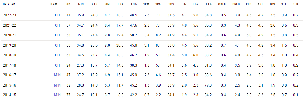 22/23시즌 시작 전에 시카고는 라빈에게 5년 2억 1520만 달러의 연장계약을 안긴다. 흠... 뭐 더 긴 얘기는 하지 않겠다. 오!버!페!이! 기록만 본다면 정말 준수한 선수지만 그냥 공격만 잘하는 반쪽 선수!! 그리고 기복이 심한 선수!! 정도로 평가받는거 같다.