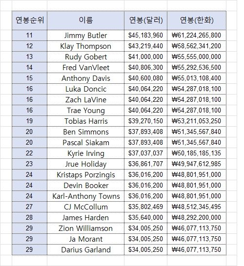 한국 시간으로 어제 NBA가 개막했다. 올해는 슈퍼팀들이 다수 등장해서 어떤 팀이 과연 챔피언 트로피를 가져갈까 정말 궁금한 시즌이다. 23/24 시즌 NBA선수들의 연봉순위 Top 30을 역순으로 소개하